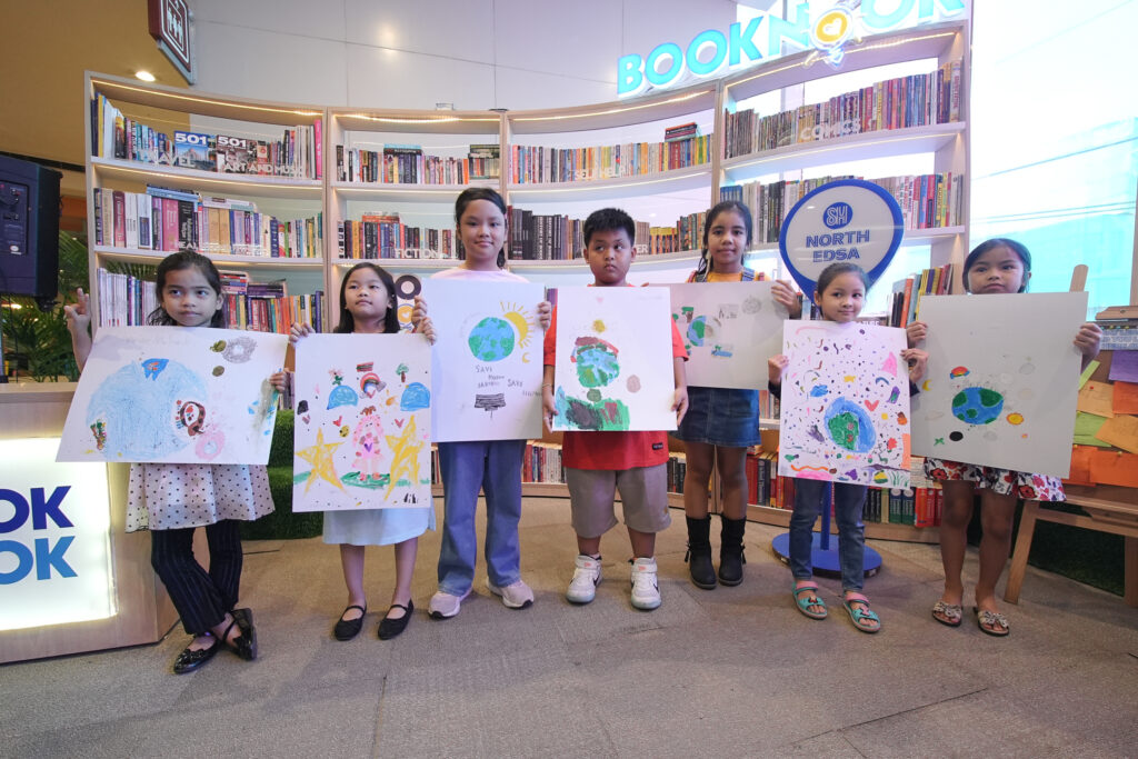 Young kids showcase Earth-themed artworks at the Book Nook in SM North EDSA, highlighting the importance of engaging young minds in environmental awareness.